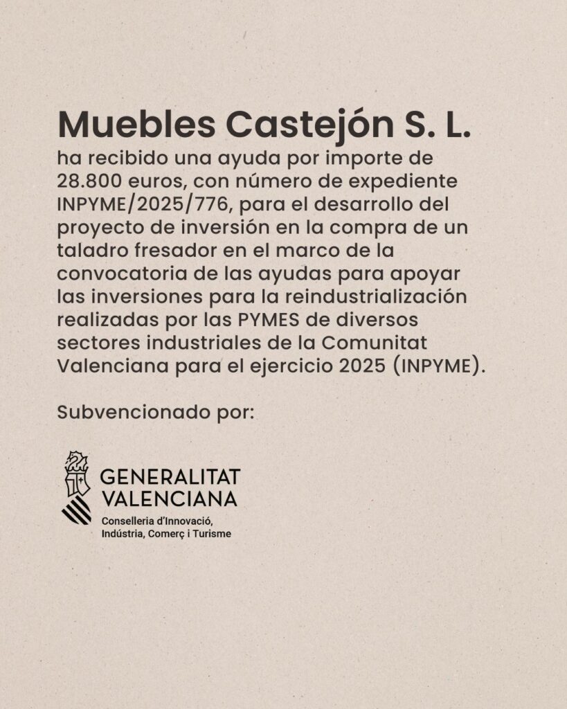 Muebles Castejón S. L. ha recibido una ayuda por importe de 28.800 euros, con número de expediente INPYME/2025/776, para el desarrollo del proyecto de inversión en la compra de un taladro fresador en el marco de la convocatoria de las ayudas para apoyar las inversiones para la reindustrialización realizadas por las PYMES de diversos sectores industriales de la Comunitat Valenciana para el ejercicio 2025 (INPYME).